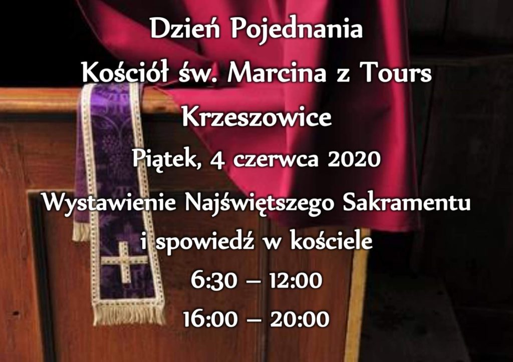 Dzień spowiedzi Posted on 4 czerwca 2020 by Admin W dniu jutrzejszym (5 czerwca) z okazji pierwszego piątku miesiąca zapraszamy do przystąpienia do sakramentu pokuty. Kapłani czekają w podanych godzinach. Wtedy też wystawiony będzie Najświętszy Sakrament.