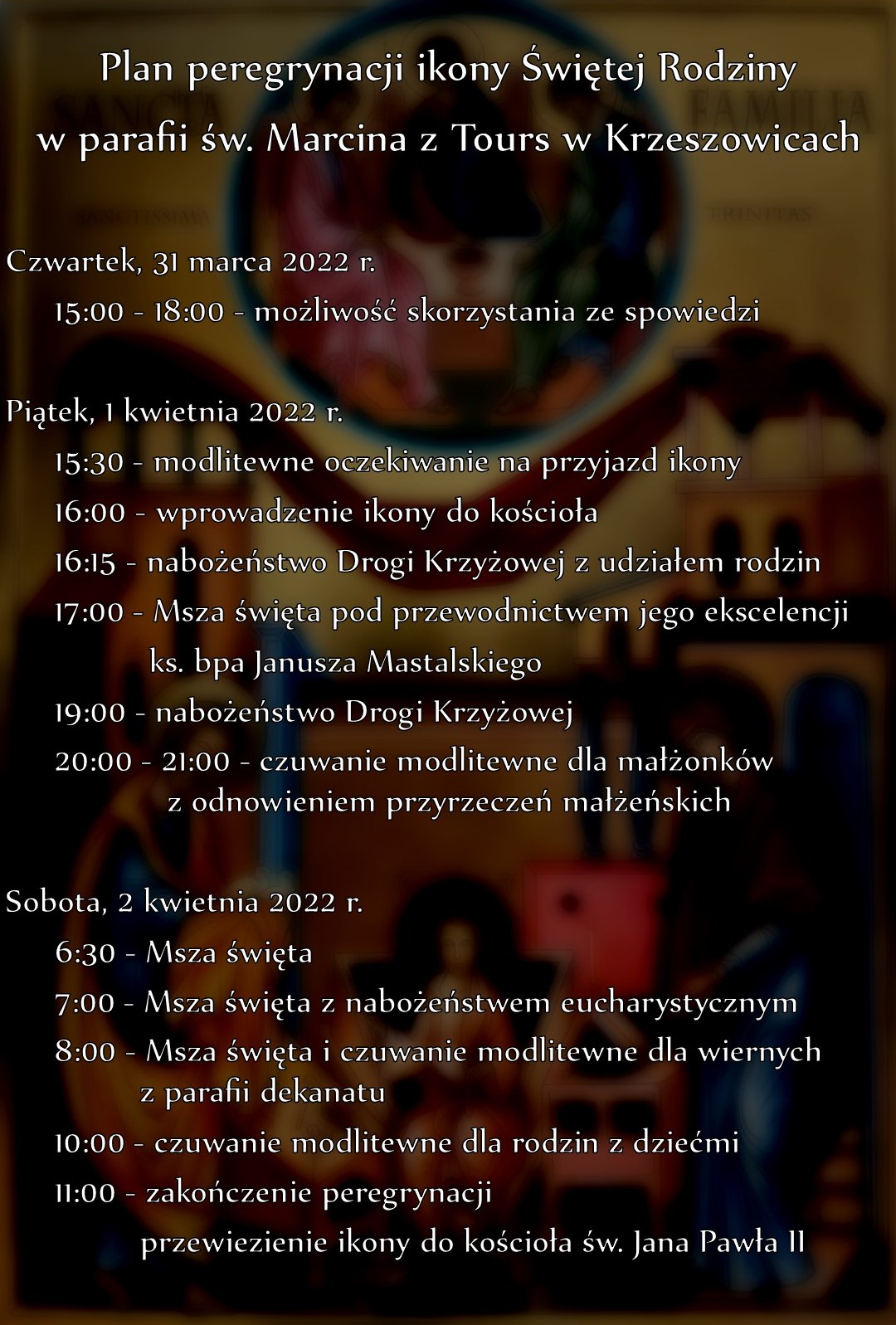 W piątek (1 kwietnia) rozpocznie się peregrynacja Ikony Św. Rodziny. O godz. 15.30 będzie krótkie nabożeństwo w kościele, po czym o godz. 15.45 wyjdziemy przed kościół, gdzie nastąpi powitanie Ikony, po czym w procesji wprowadzimy Świętą Ikonę do kościoła i rozpocznie się Droga Krzyżowa dla dzieci i dorosłych. O godz. 17.00 jego ekscelencja ks. bp. Janusz Mastalski będzie przewodniczył Mszy św. koncelebrowanej z udziałem księży z naszego dekanatu. Po Mszy św. będzie adoracja Obrazu Św. Ikony. O godz. 19.00 Droga Krzyżowa dla młodzieży i dorosłych, a o 20.00 czuwanie modlitewne z odnowieniem przyrzeczeń małżeńskich. O godz. 21.00 zakończymy adorację Apelem Jasnogórskim.